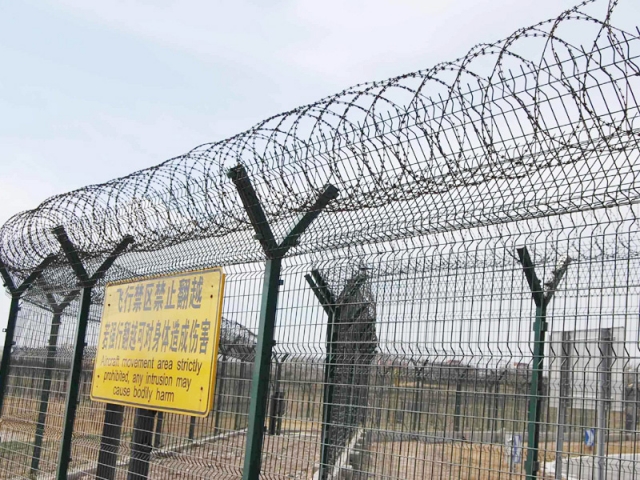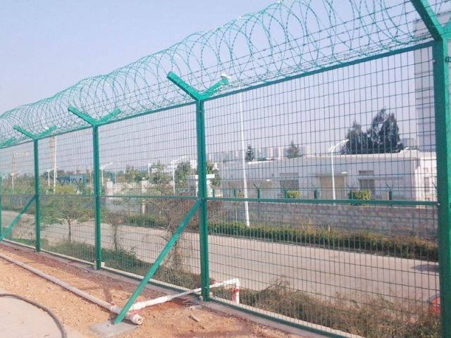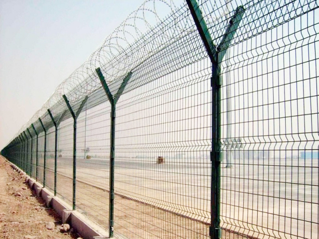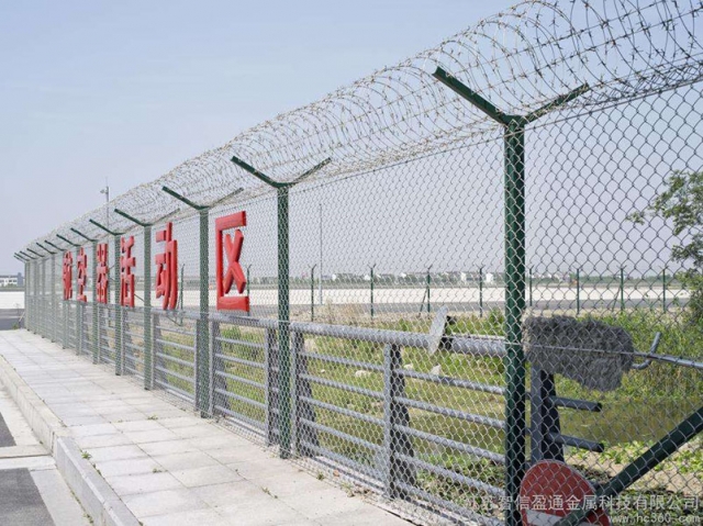 機場圍界就是應(yīng)用于機場跑道兩側(cè)的隔離網(wǎng),作用是防止行人誤入跑道,影響飛機正常運行的有效措施。這個機場圍界也分為機場內(nèi)隔離與機場外隔離,機場內(nèi)隔離的要求更高,頂部設(shè)置刀刺網(wǎng),外隔離就比較簡單一些,主要還是防止閑雜或者違法人員進入飛行禁區(qū),盡管這雙重保護之下,還是會有人進行每天巡邏,以防止個別情況發(fā)生。機場圍界廣泛應(yīng)用于各大飛機場的邊界,用作邊界圍欄防護網(wǎng),還可以用于港口圍界防護、碼頭鋼絲防護網(wǎng)、飛機場防護護欄網(wǎng)、Y型安全防御護網(wǎng),也可以用于公園、動物園、賓館酒店、市政道路等領(lǐng)地周邊的安全防護圍網(wǎng)。